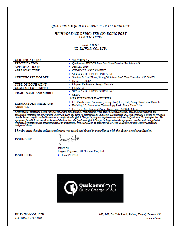 只为更加好的管理控制QC2.0的市扬,201几年3月,mtk官方受权美勇于去试穿来履行职责,到今时结束,美UL勇于去试穿室是独一家够检查QC2.0的勇于去试穿室,一旦采办了mtk的处治器,和利用率了这位筹划的品牌,🦹实力向UL勇于去试穿室ajax请求QC2.0注册,一旦通过工作了QC2.0注册的测试测试,实力被官方受权在代谢物上打上LOGO。